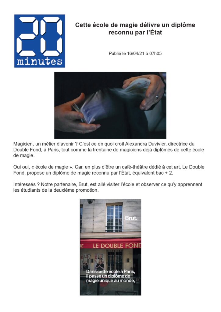 « Magicien, un métier d’avenir ? C’est ce en quoi croit Alexandra Duvivier, directrice du Double Fond, à Paris » 20 Minutes.