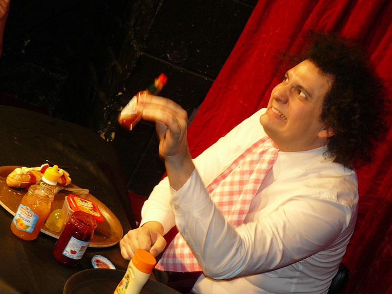 Comme c’est une première, les accessoires ne suivent pas toujours et Eric est trahi par un infâme petit pain qui quitte le numéro avant le climax… (C’est comme ça qu’on dit ?)…et là, normalement, le tour devrait être mort et l’artiste un peu …ennuyé non ??…que nenni, Eric est mort ….mais de rire ,performe et fini en apothéose…ben oui, les gars fallait être là !