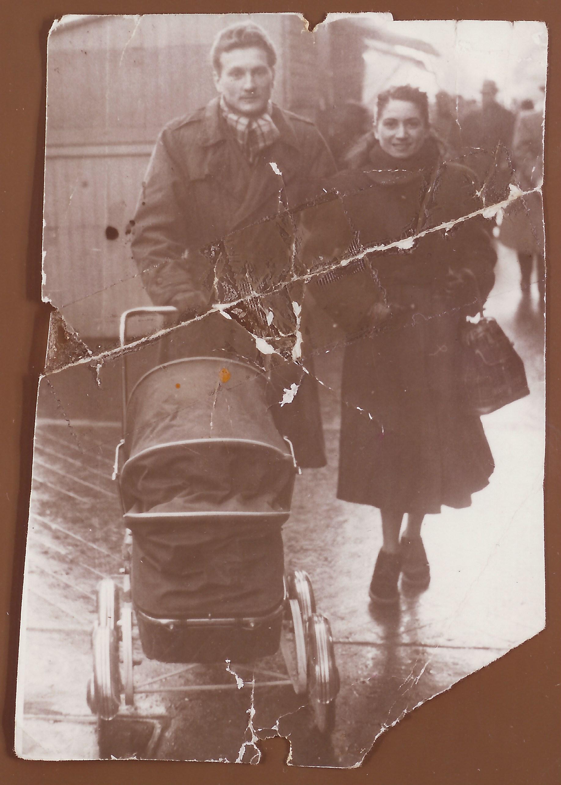 Mon père, ma mère et moi (dans la poussette). Nous sommes dans un autre siècle, mes parents sont fauchés comme les blés, pas dans une santé éblouissante, mais ils s’aiment et je le sens dans ma petite voiture (déjà une Mercedes ?!). Cette photo me rappelle les films avec Gabin, le noir et blanc, une ambiance particulière quoi !