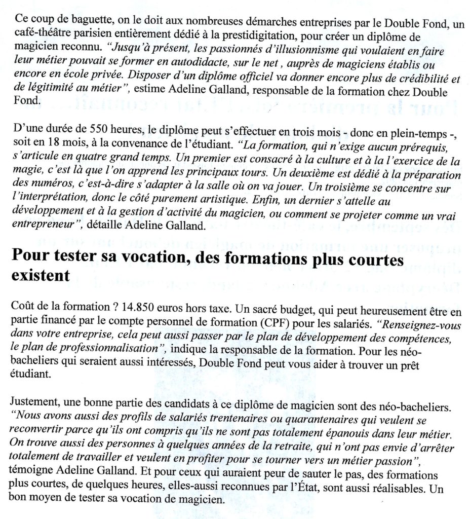 Ici une publication sur le blog de magie Jmag (avec à la fin une interview d’Adeline Galland) : http://jmag.fr/magie-pour-magicien/actualites-illusion-prestidigitation/diplome-magicien-etat-reconnu-bac2